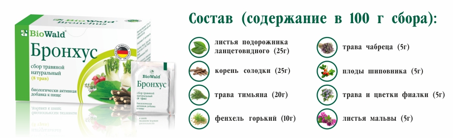 Сбор из 8 трав содержит эфирные масла (дополнительный источник терпеноидов и глицирризиновой кислоты) и используется для поддержания физиологических функций дыхательной системы.